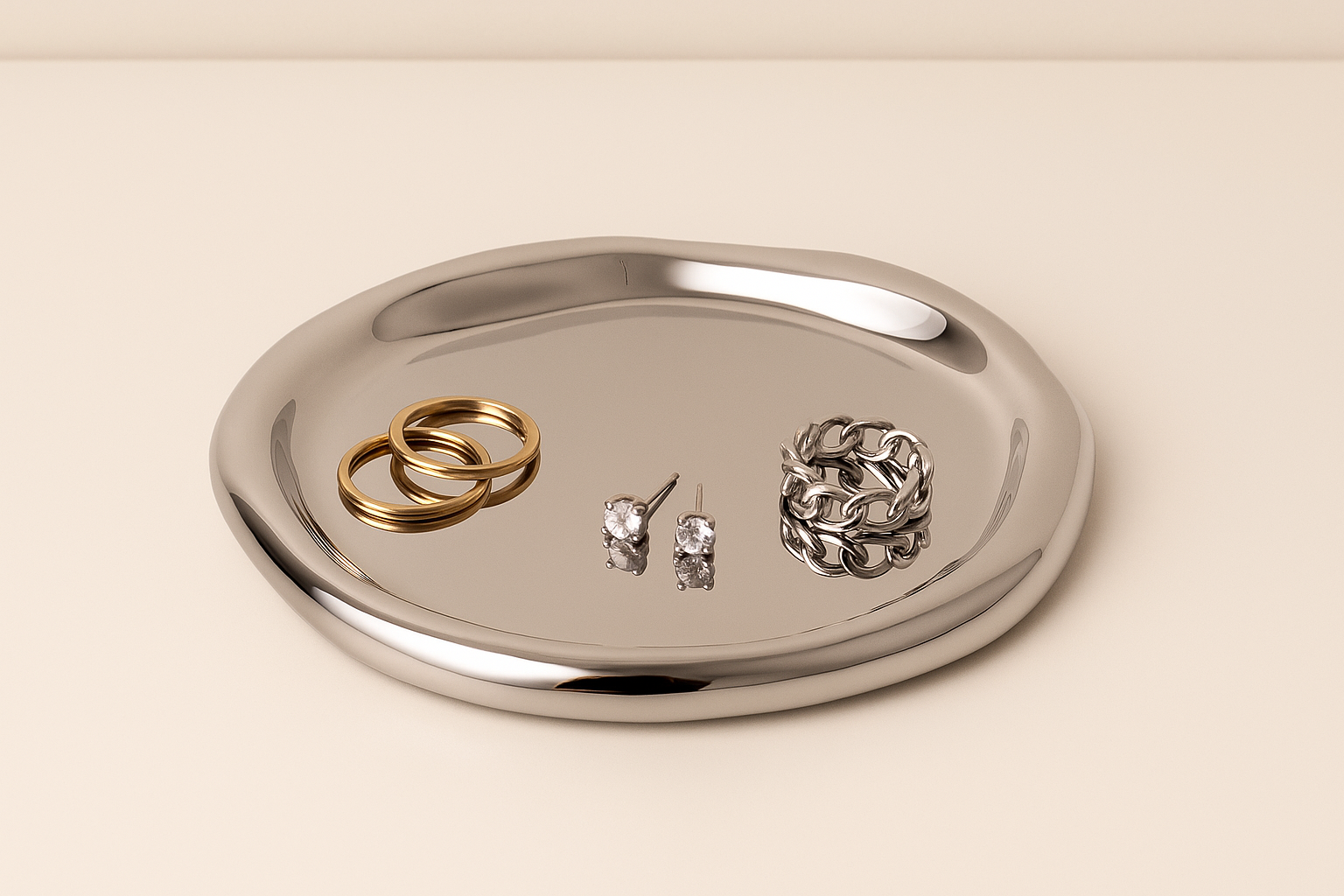 Add a touch of modern elegance to your vanity or dresser with this silver-plated jewellery tray. Designed with a unique, organic round shape and a high-gloss finish, it beautifully reflects light while keeping your rings, earrings, and small accessories neatly displayed. Its artistic form makes it both a functional storage piece and a stylish accent for any space.